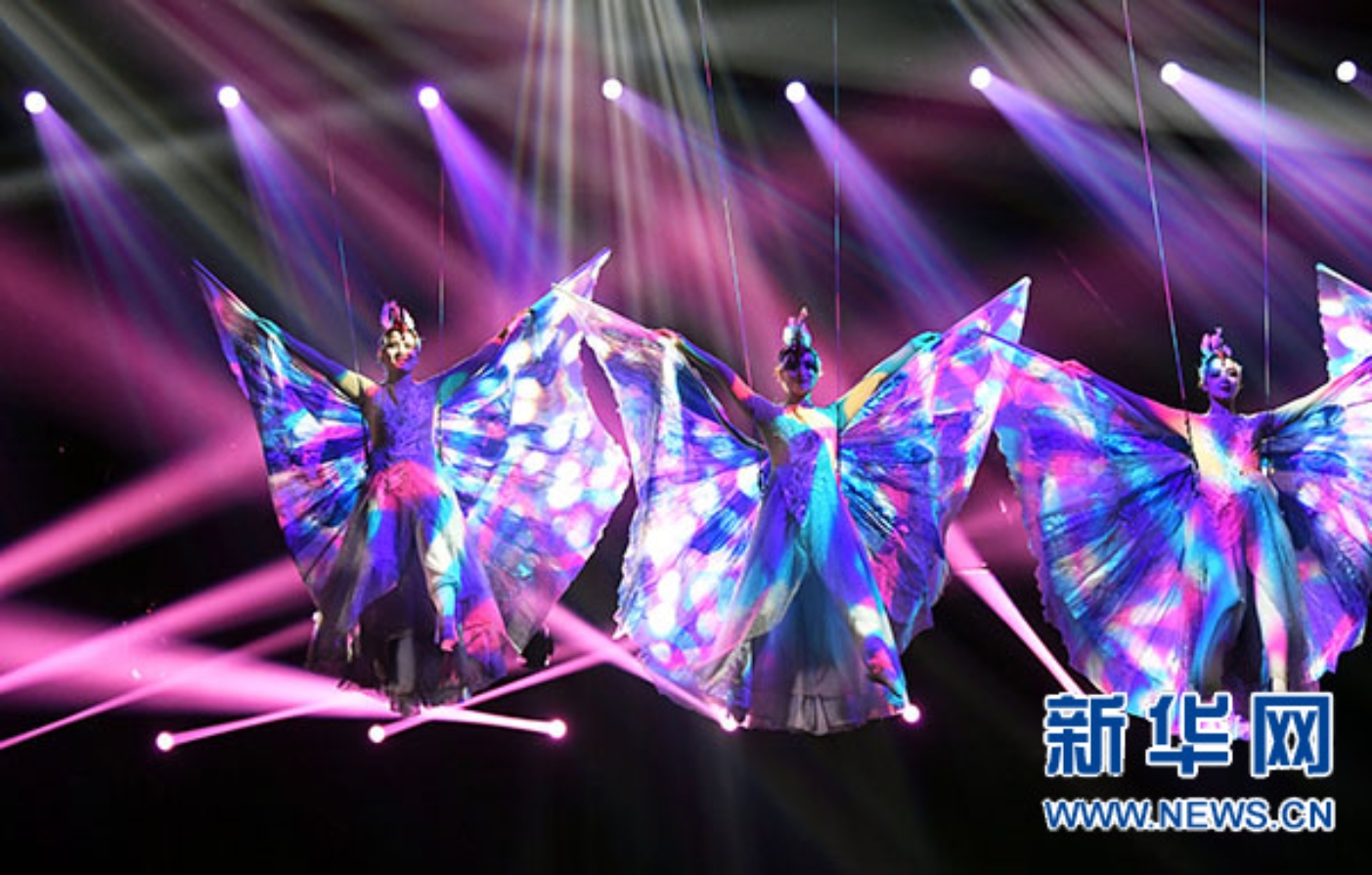 2018年10月16日,演员在濮阳国际杂技艺术节上表演杂技《如蝶飞舞》。新华社记者 朱祥 摄