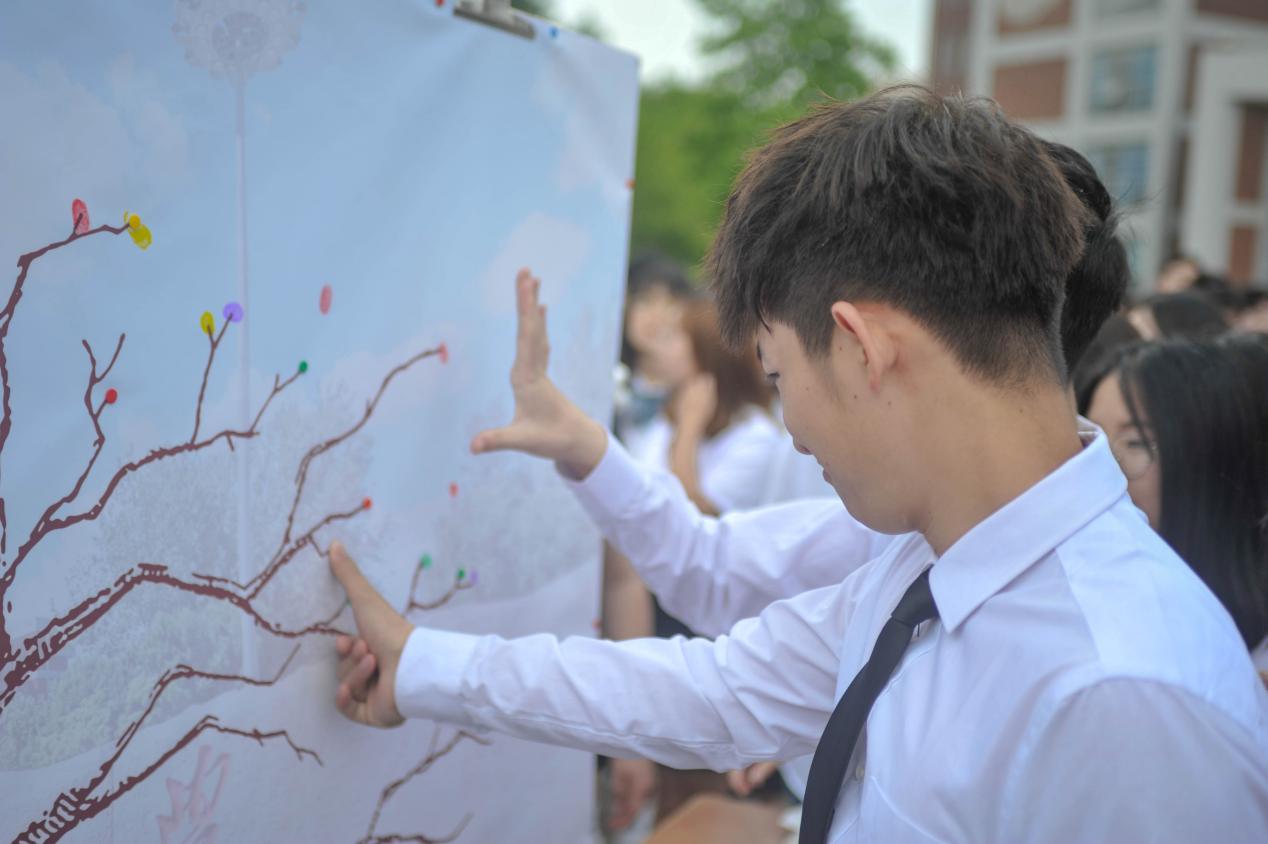 在毕业树绘制环节,韩金玉和毕业生代表李晓霞同学共同在毕业树上留下指纹,其他嘉宾和在场同学也随后按下了自己的指纹,共同绘制属于2021届毕业生的青春之树。树是根文化的最好体现,学子的根深植与母校,母校终生为学子提供养料,承载每位学子的青春年轮,而每位学子的成绩又成就了母校的枝繁叶茂、开花结果。指纹代表契约精神,全体毕业生用指纹绘制毕业树,既是“画指为信”的同窗约定,也有共绘蓝图、携手奋进的寓意。